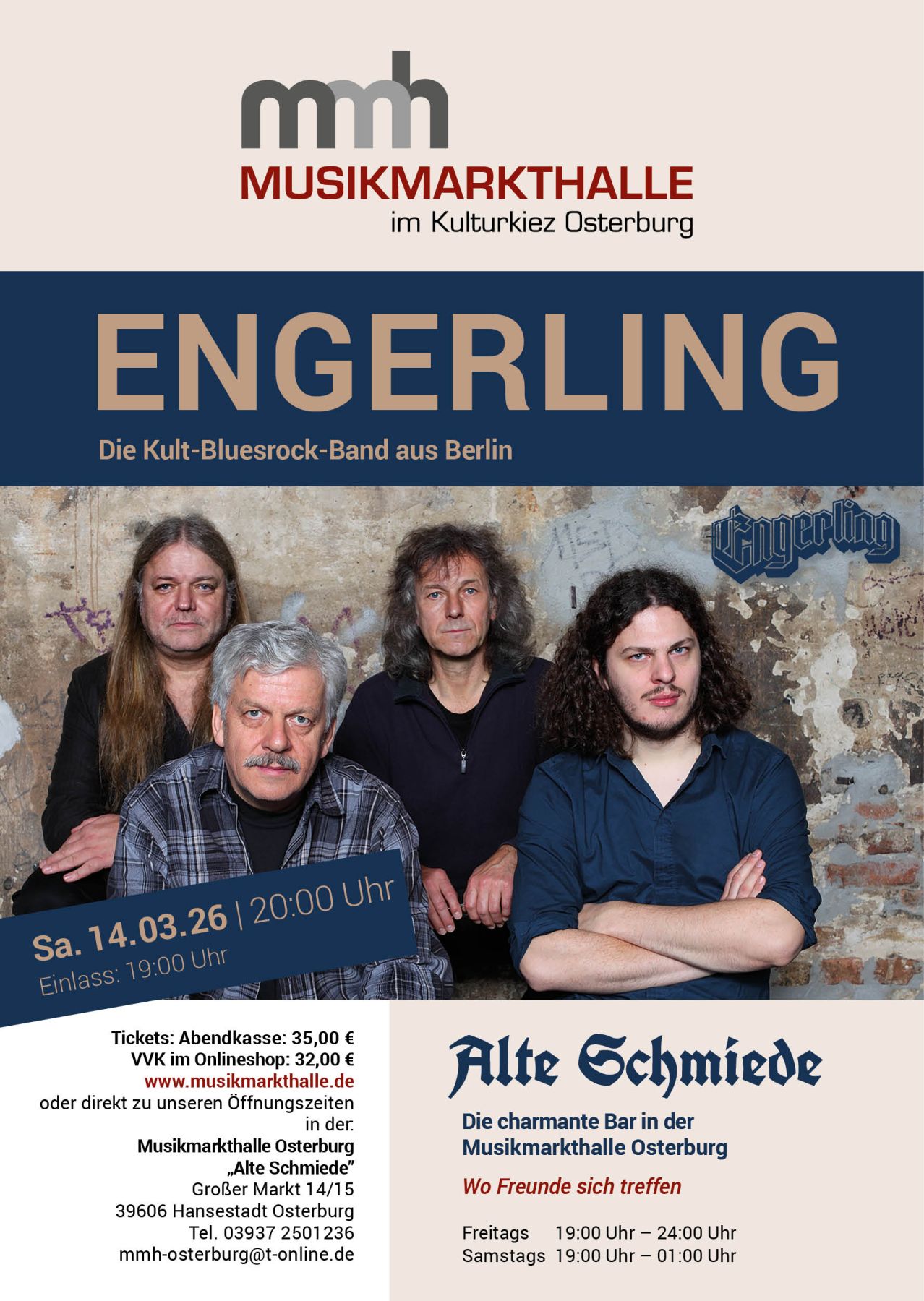 Karten online kaufen. Vorverkauf vom 01.12.2025 bis 14.03.2026 Tickets für ENGERLINGDie Kult-Bluesrock-Band aus BerlinMusikmarkthalle OsterburgEinlass 19:00 Uhr